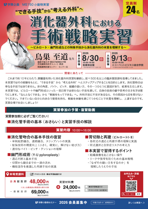 これまで約10年にわたり、豚臓器を用いた消化器外科実習を継続し、延べ500名以上の臨床獣医師を指導してきました。本実習ではその経験をもとに、“できる手技”から“考える外科”へとステップアップすることを目的とします。消化管吻合は単なる手技ではありません。針の角度、バイト、ピッチ、組織の扱い方、その一つひとつに意図があり、結果を左右します。本実習では、ビルロートや幽門形成といった一見日常では使わない手技を通して、自身の技術の癖や思考の甘さを浮き彫りにします。「なんとなくできる」から「根拠をもってできる」へ。外科手技に不安があるなら、その原因から目を背けないでください。できていない自分と向き合う覚悟を持ち、根拠を体験を通じてつかむことで本質を理解し、上達するのです。実習会場でお会いしましょう!